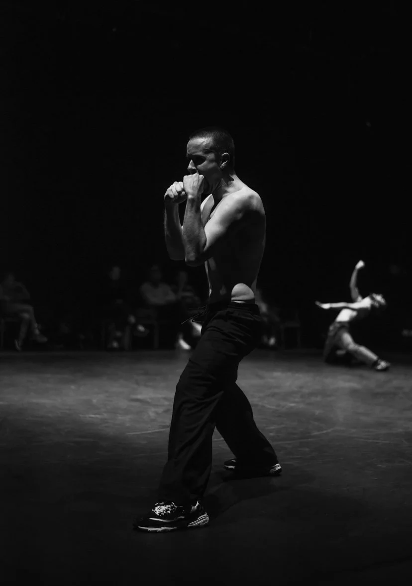 The In Between examines the tension between self-presentation and intimacy, the public and the private. Through a dynamic interplay of opposing forces, the piece gradually sheds layers—both physically and conceptually—creating a liminal space of transformation. Drawing from personal biographies and pop culture, the choreography blends playful, sensual, and instinctual movement, oscillating between control and disintegration.